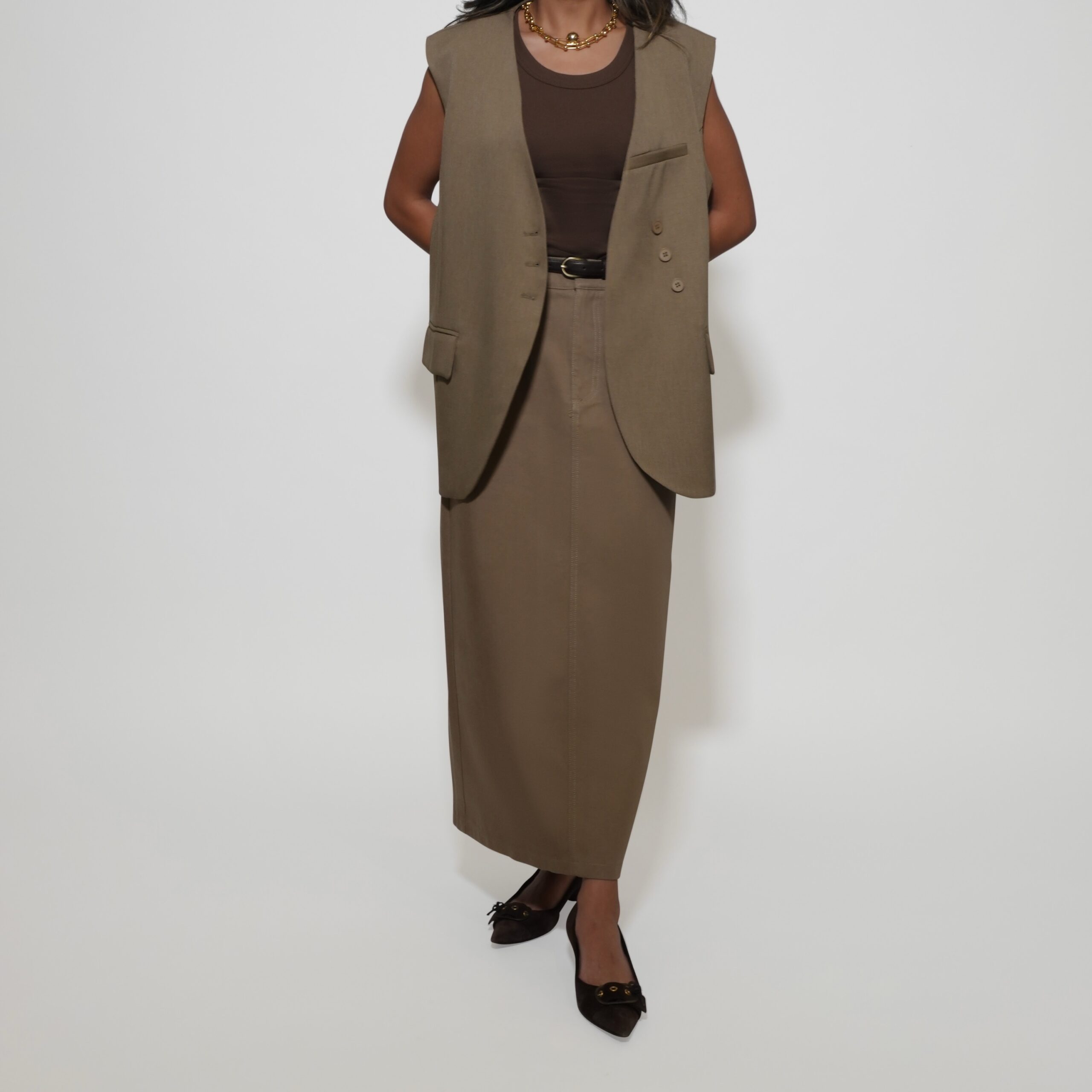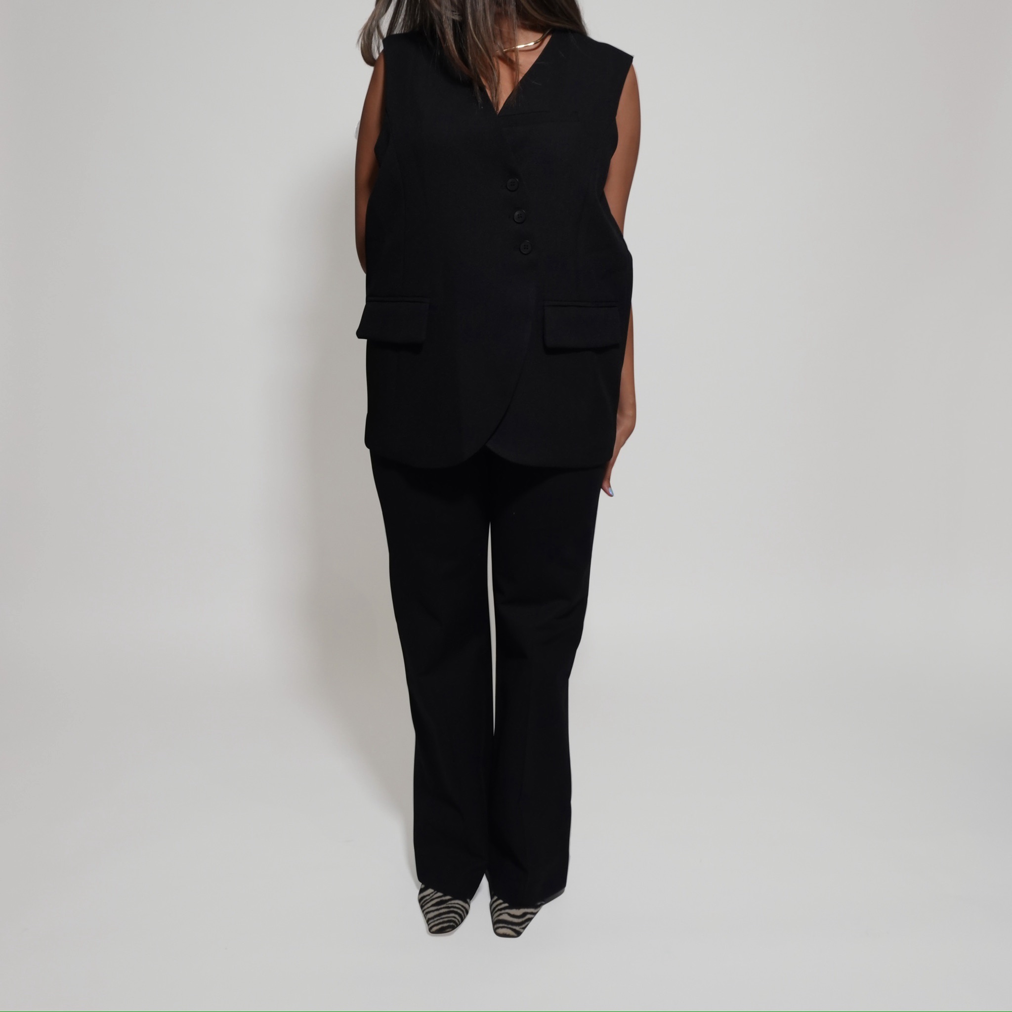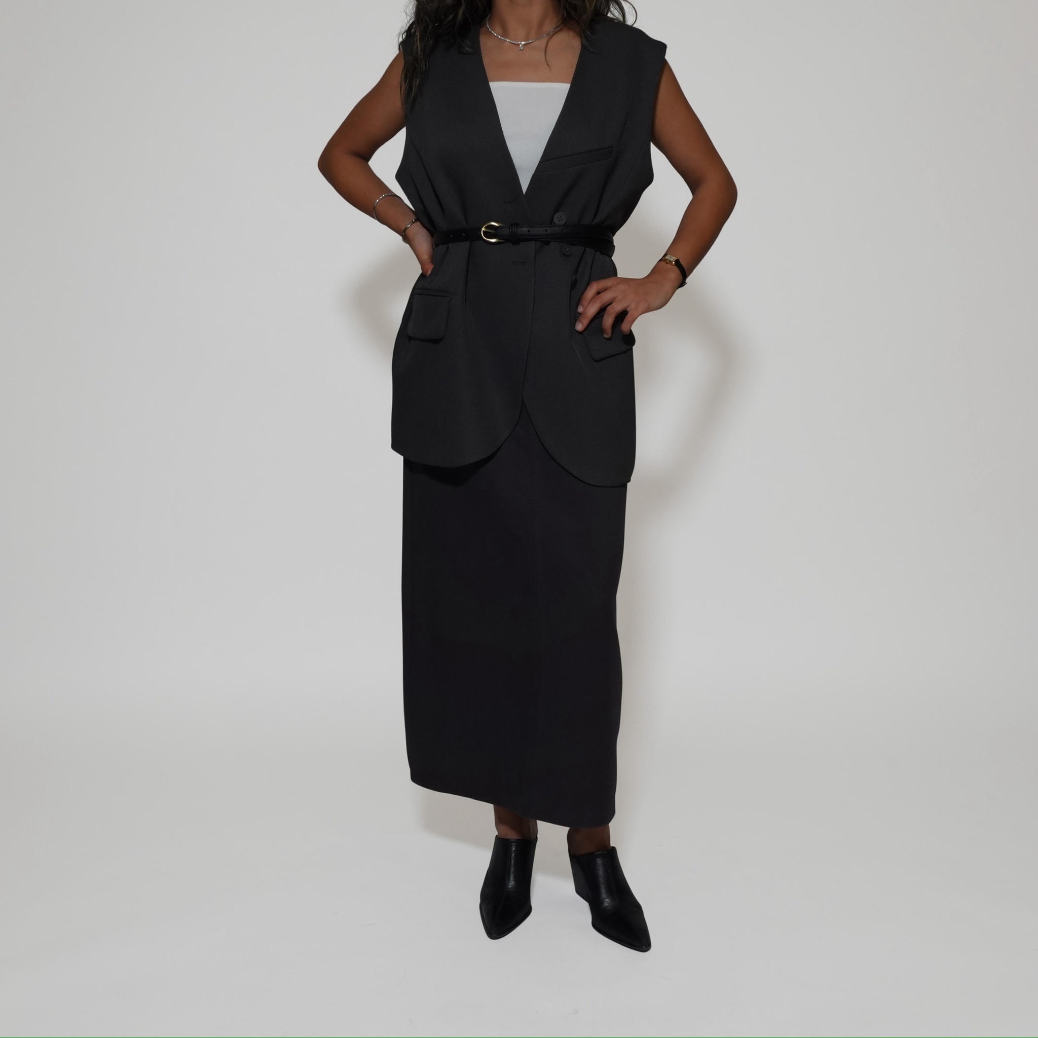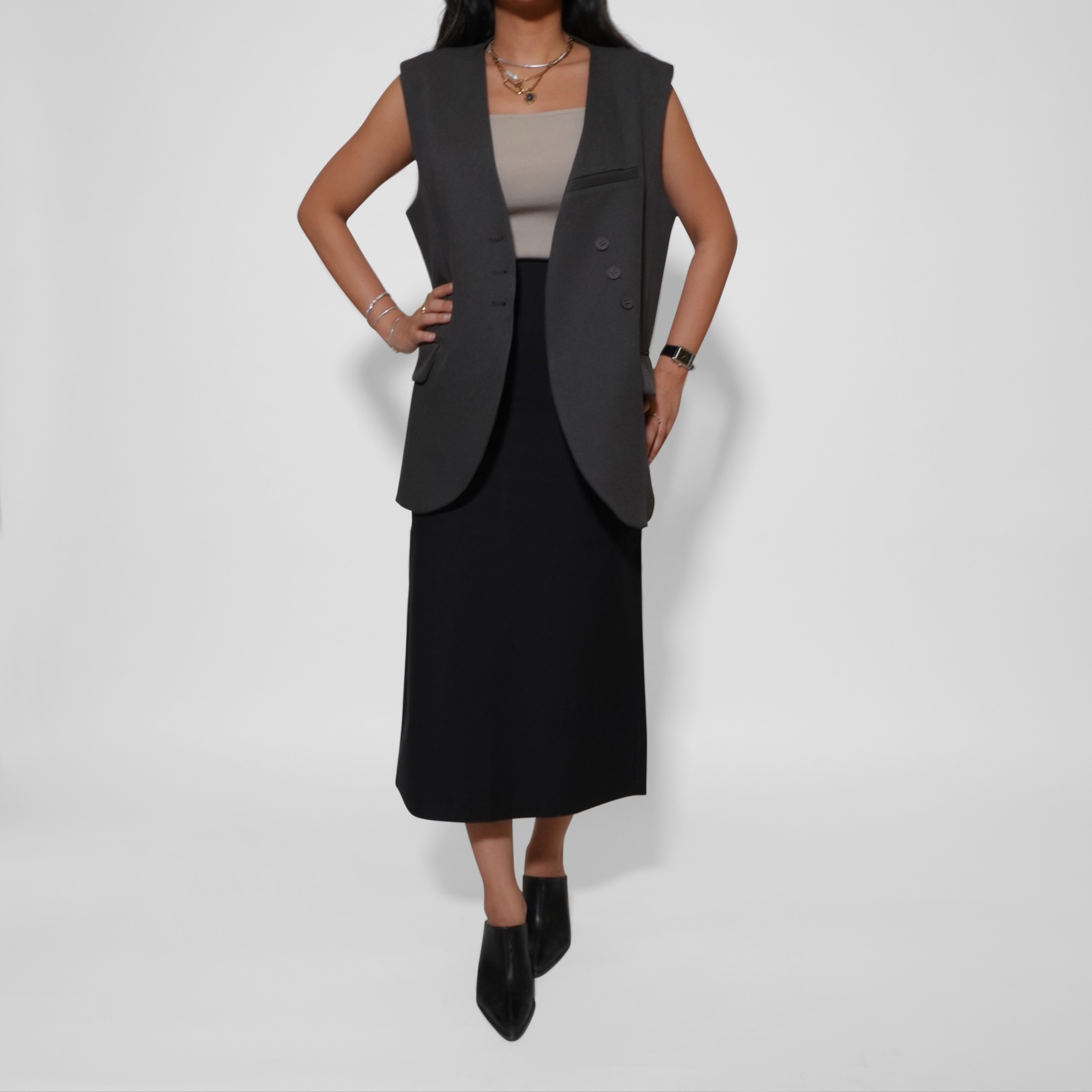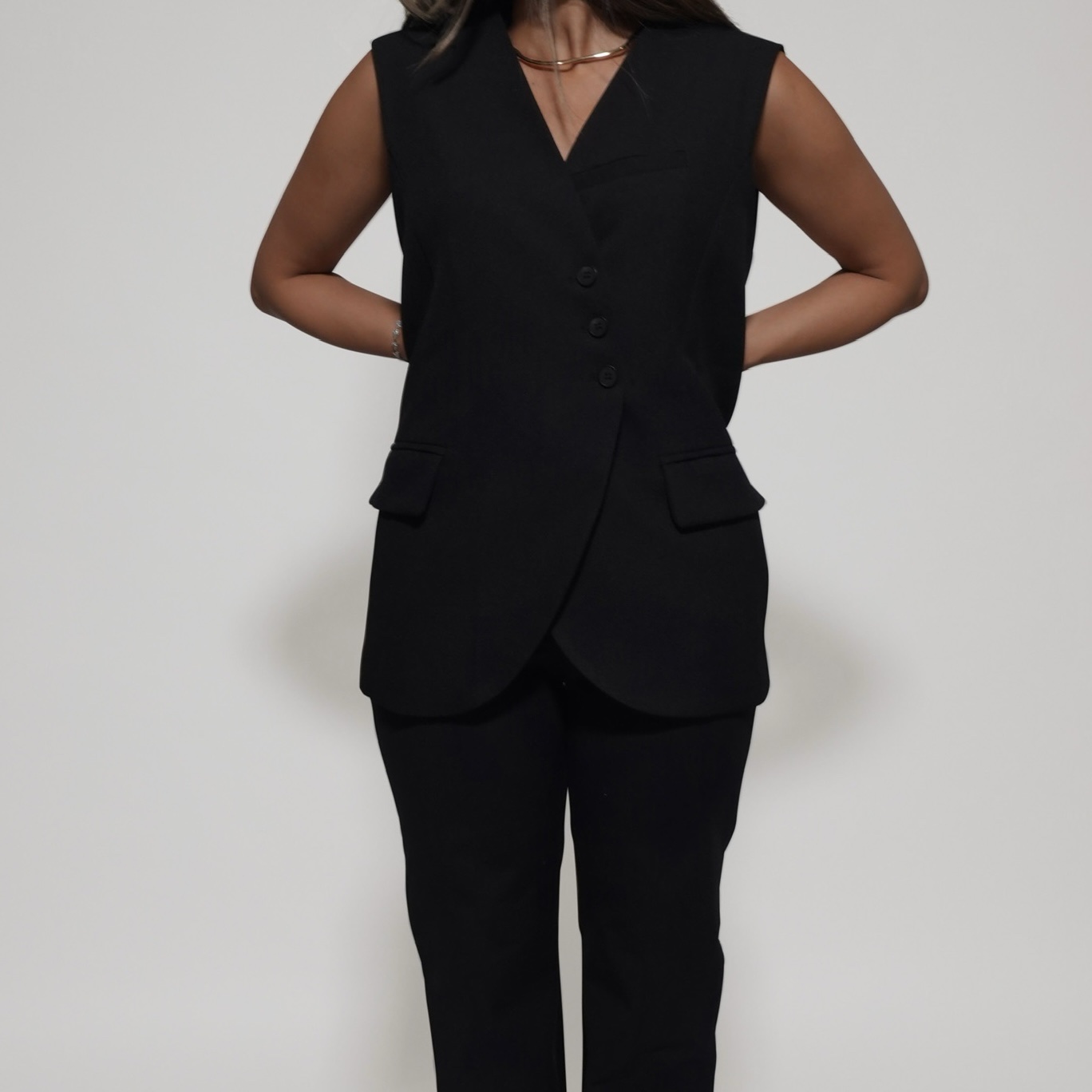 Elevate your layering with this tailored sleeveless vest, designed for a modern, structured look. Featuring a sharp lapel, front button closure, and subtle pocket detailing, it adds instant polish to any outfit. The versatile cut makes it easy to style over dresses, skirts, or trousers, transitioning effortlessly from workwear to evening chic.