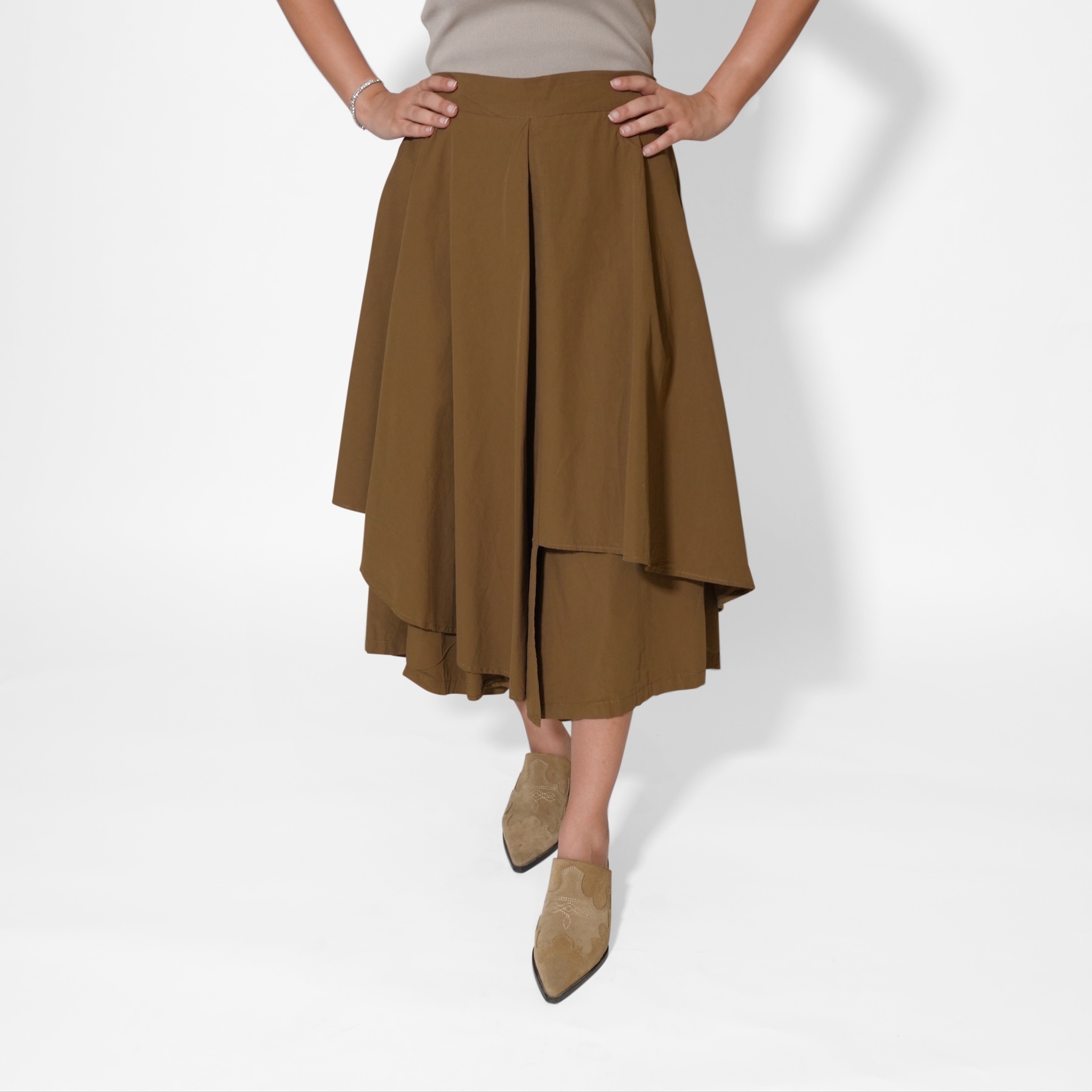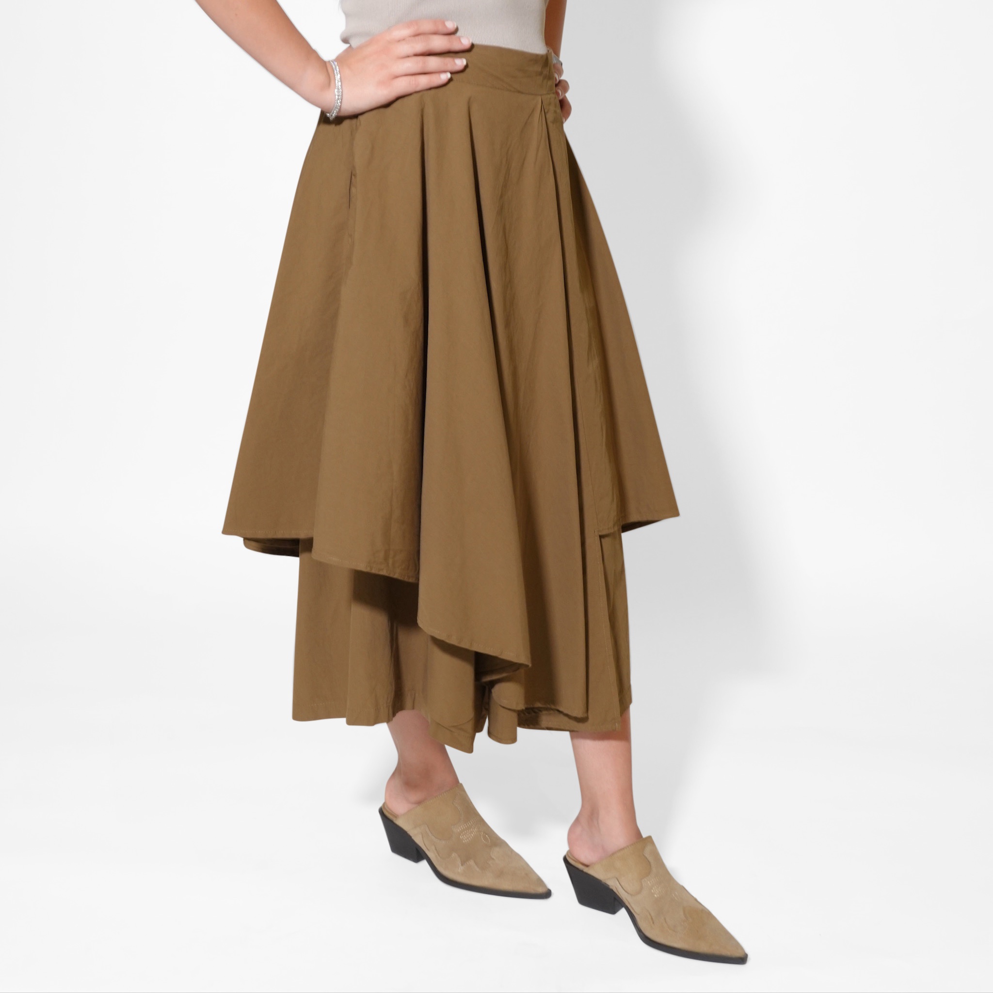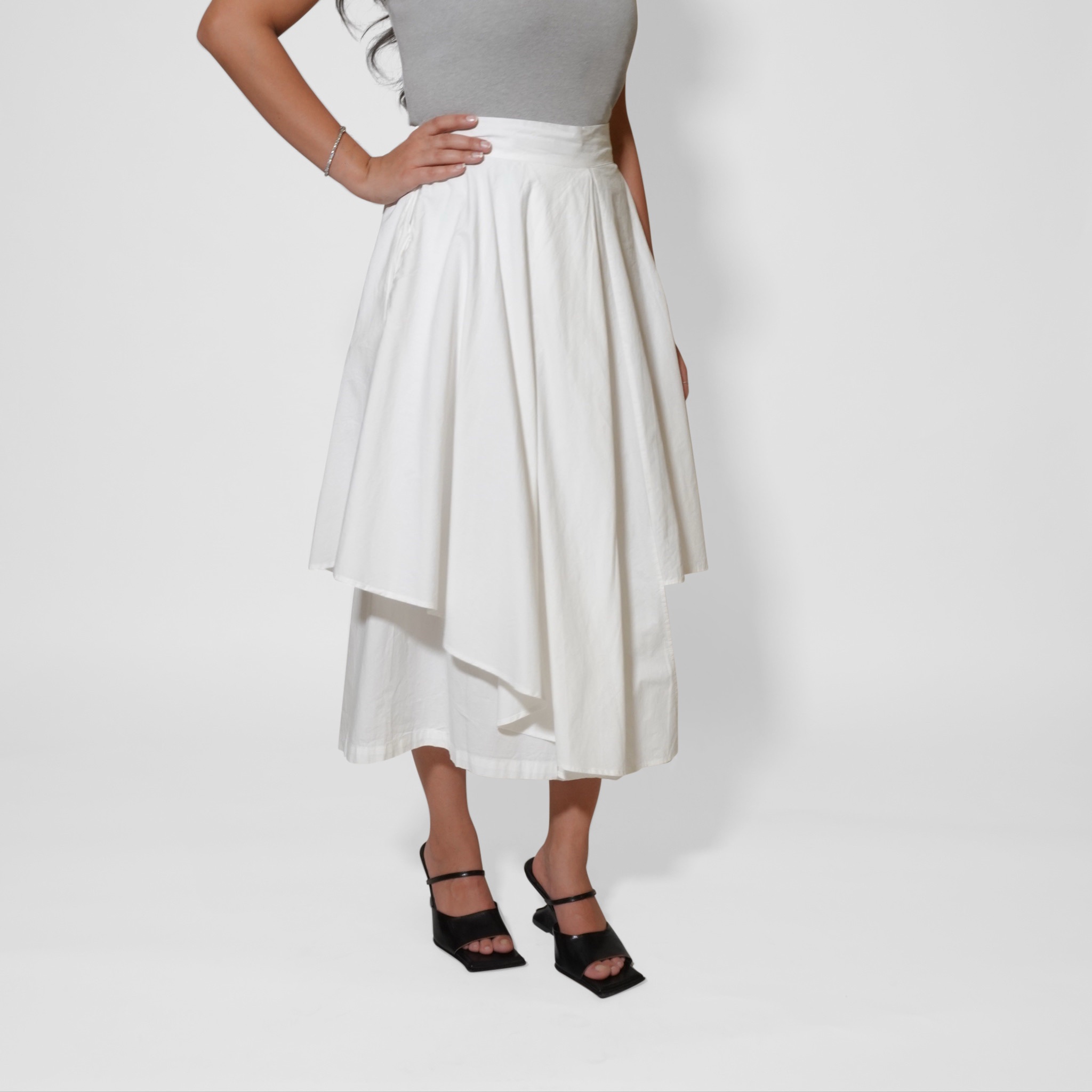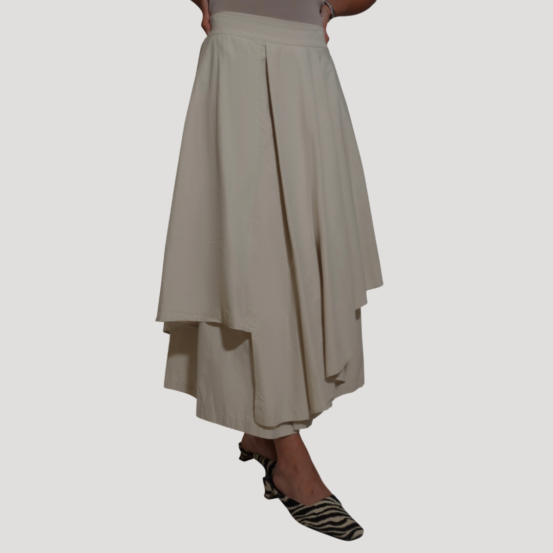 This asymmetric midi skirt brings effortless elegance with a modern twist. Designed with layered panels that create beautiful movement, it offers a sophisticated flow with every step. The structured yet lightweight fabric gives it a flattering shape, making it easy to dress up or down.