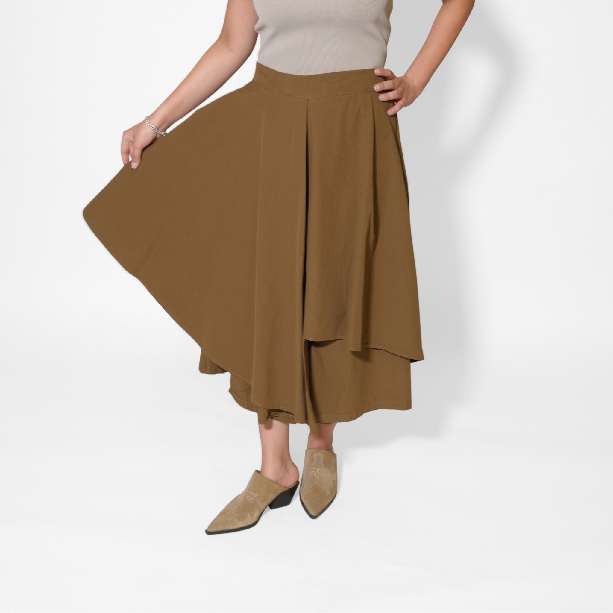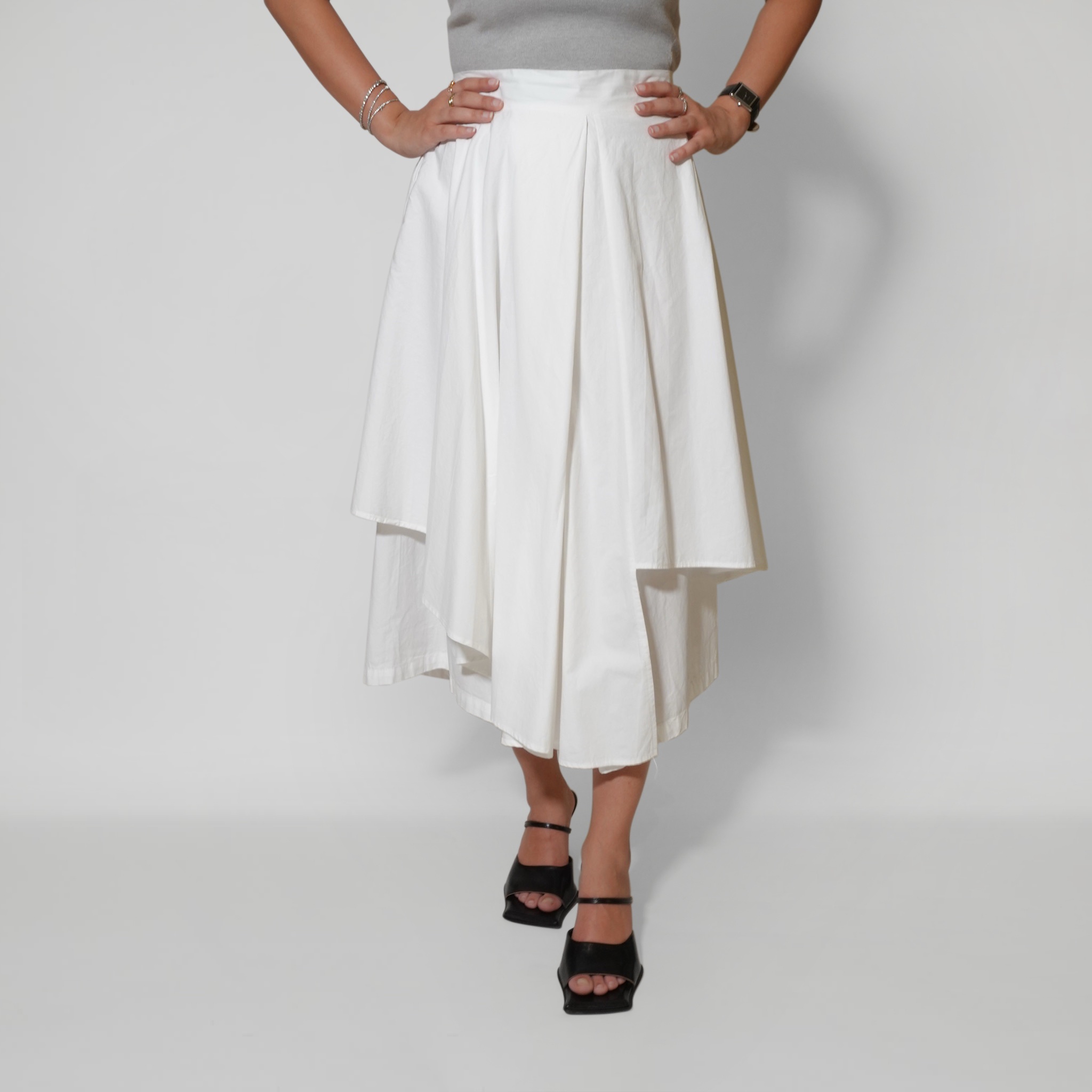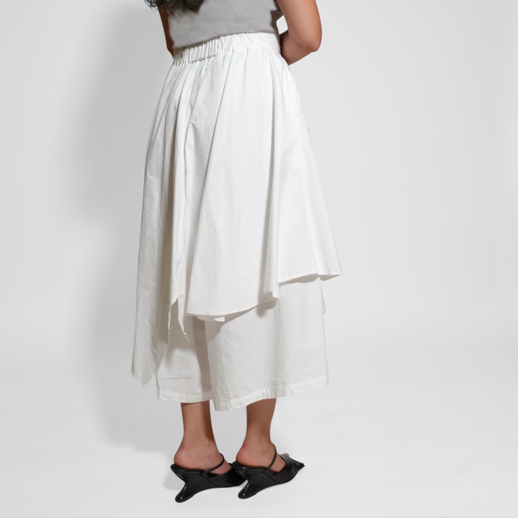 This asymmetric midi skirt brings effortless elegance with a modern twist. Designed with layered panels that create beautiful movement, it offers a sophisticated flow with every step. The structured yet lightweight fabric gives it a flattering shape, making it easy to dress up or down.
