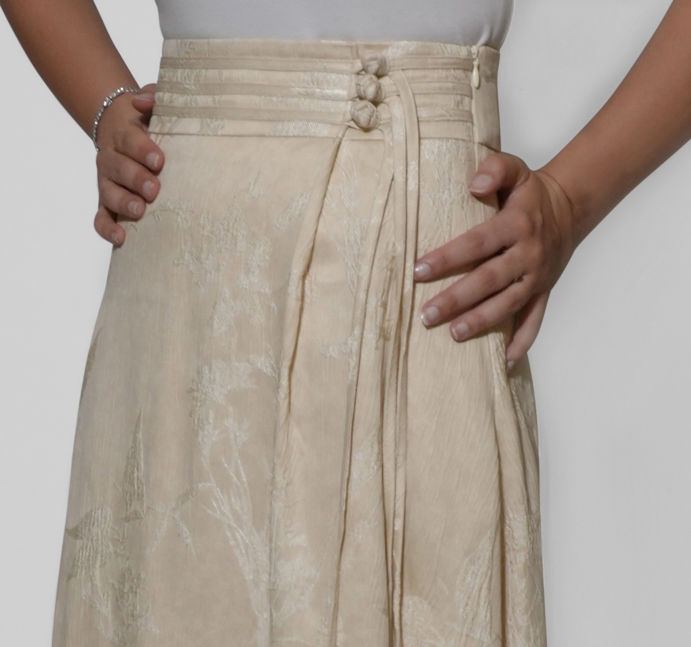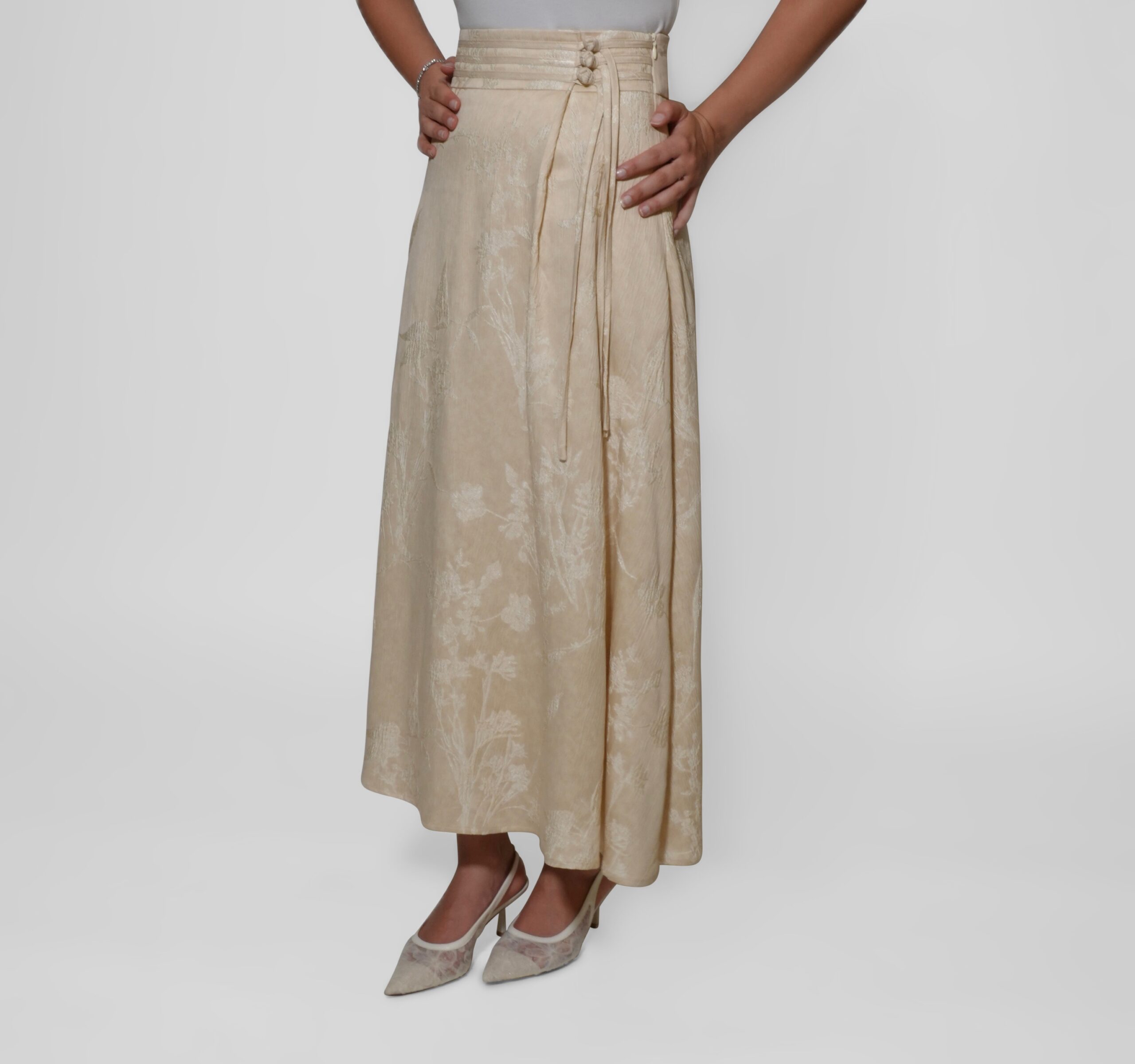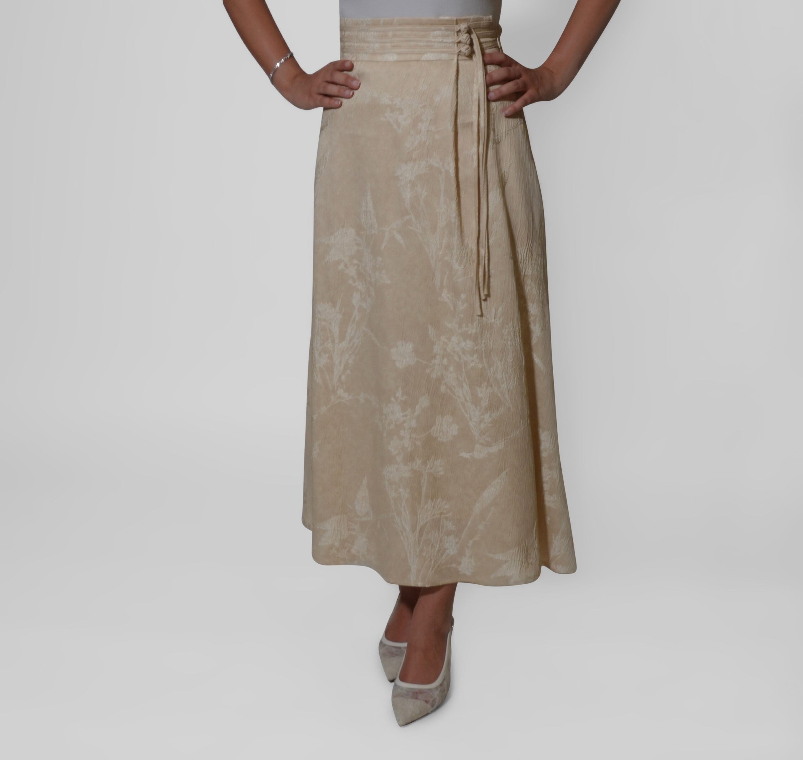 Bring subtle elegance to your wardrobe with this floral wrap midi skirt. Crafted in a soft beige, it features a delicate tonal floral pattern that adds dimension without overwhelming the look. The tie-waist detail enhances the silhouette, while the flowing cut ensures comfort and effortless movement.