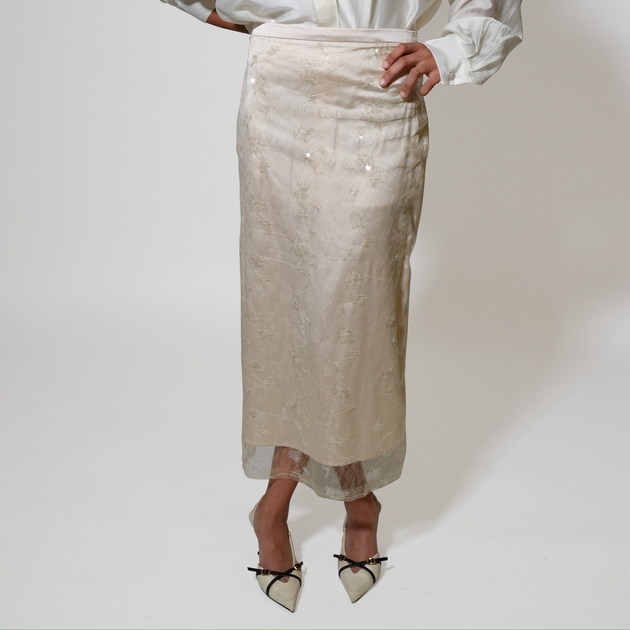 An elegant midi skirt with delicate embroidery and a sheer layered finish. Light, feminine, and perfect for refined styling.