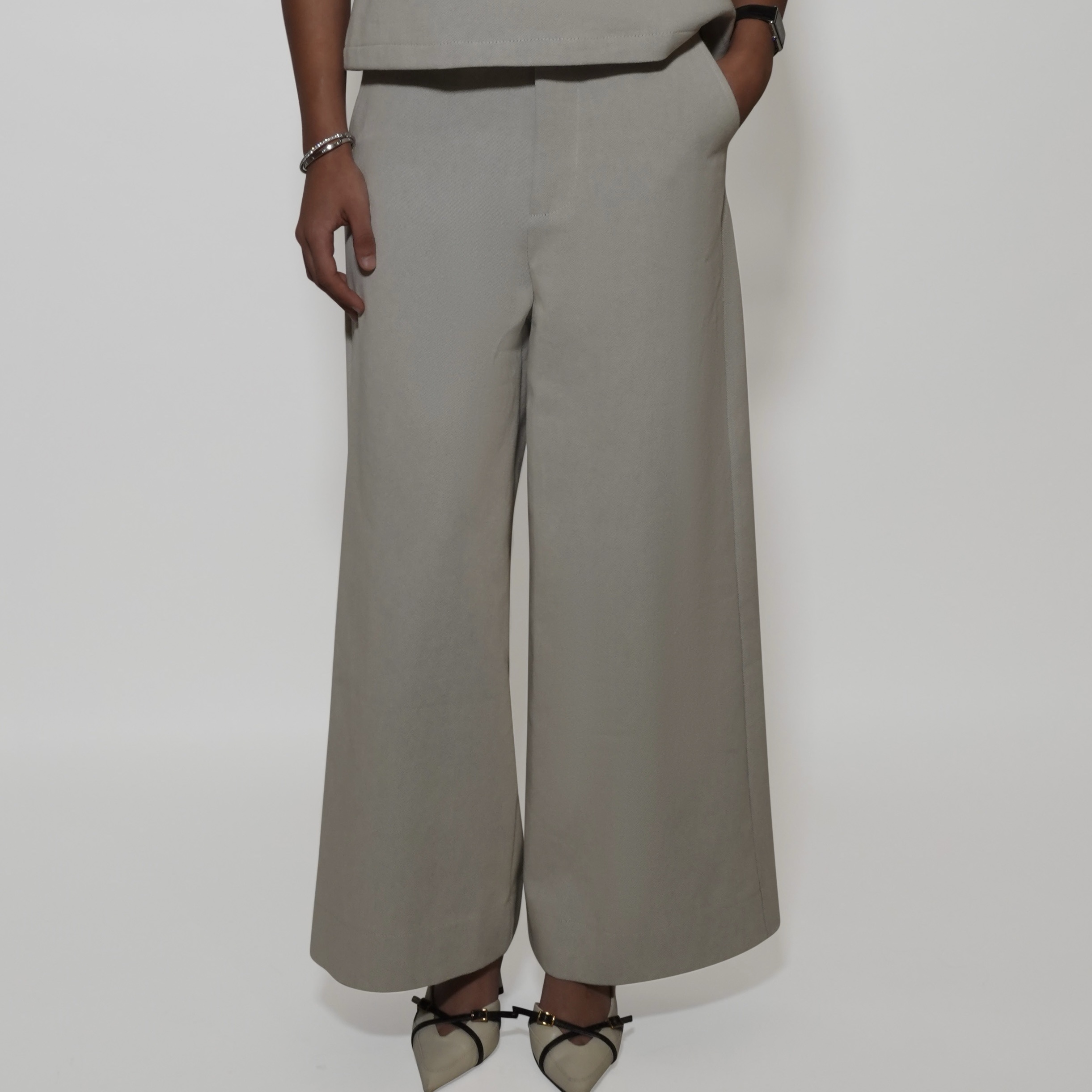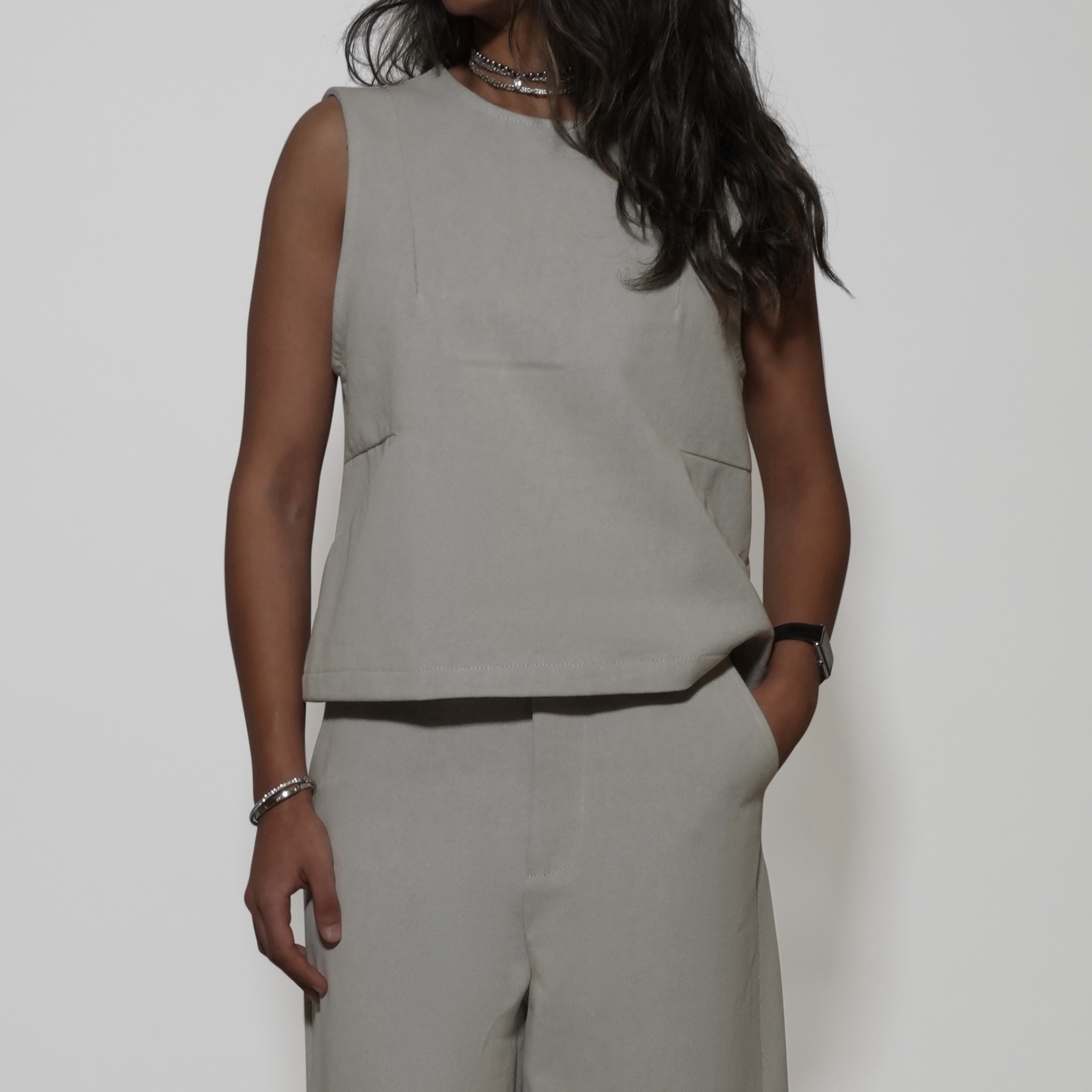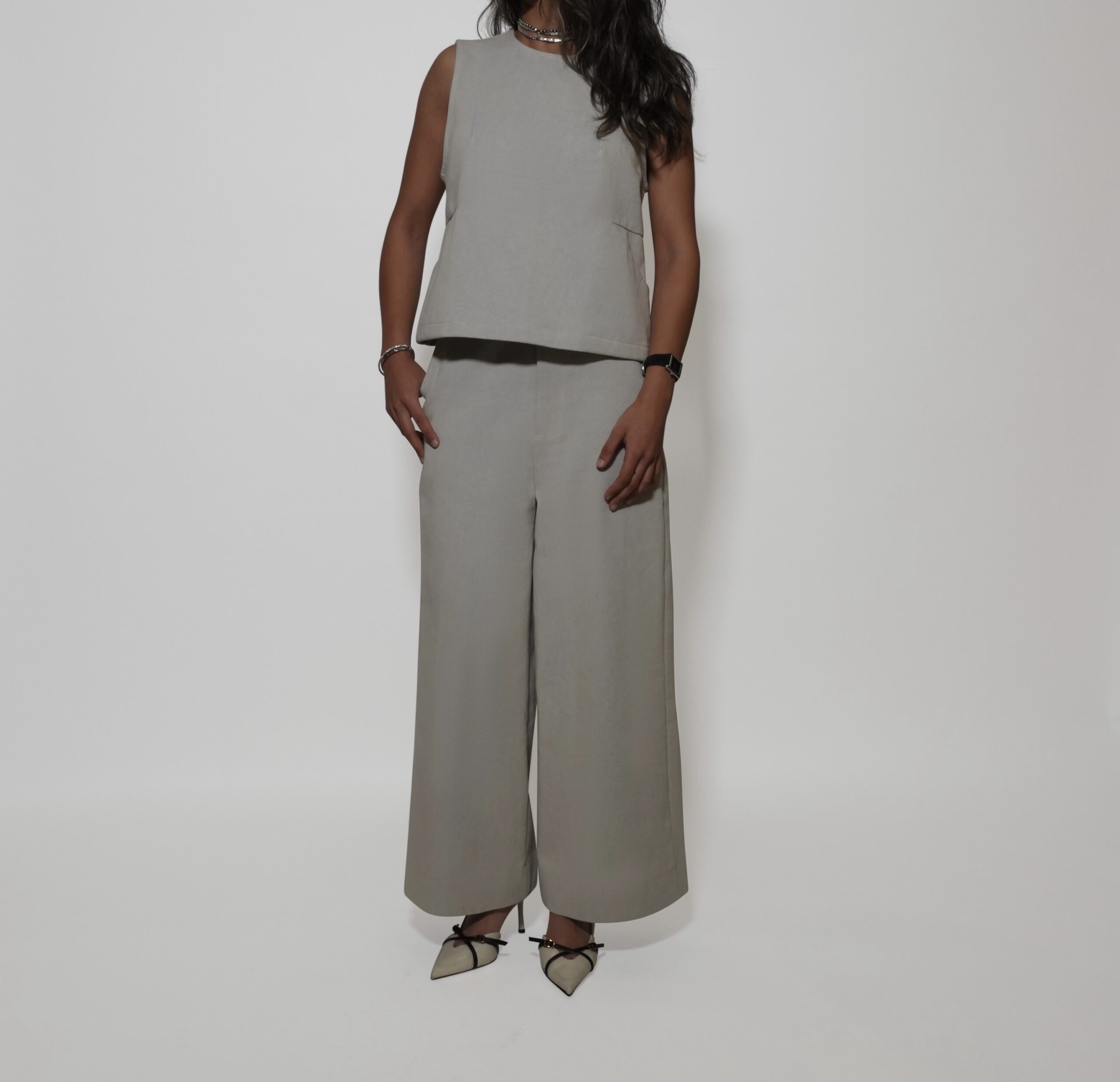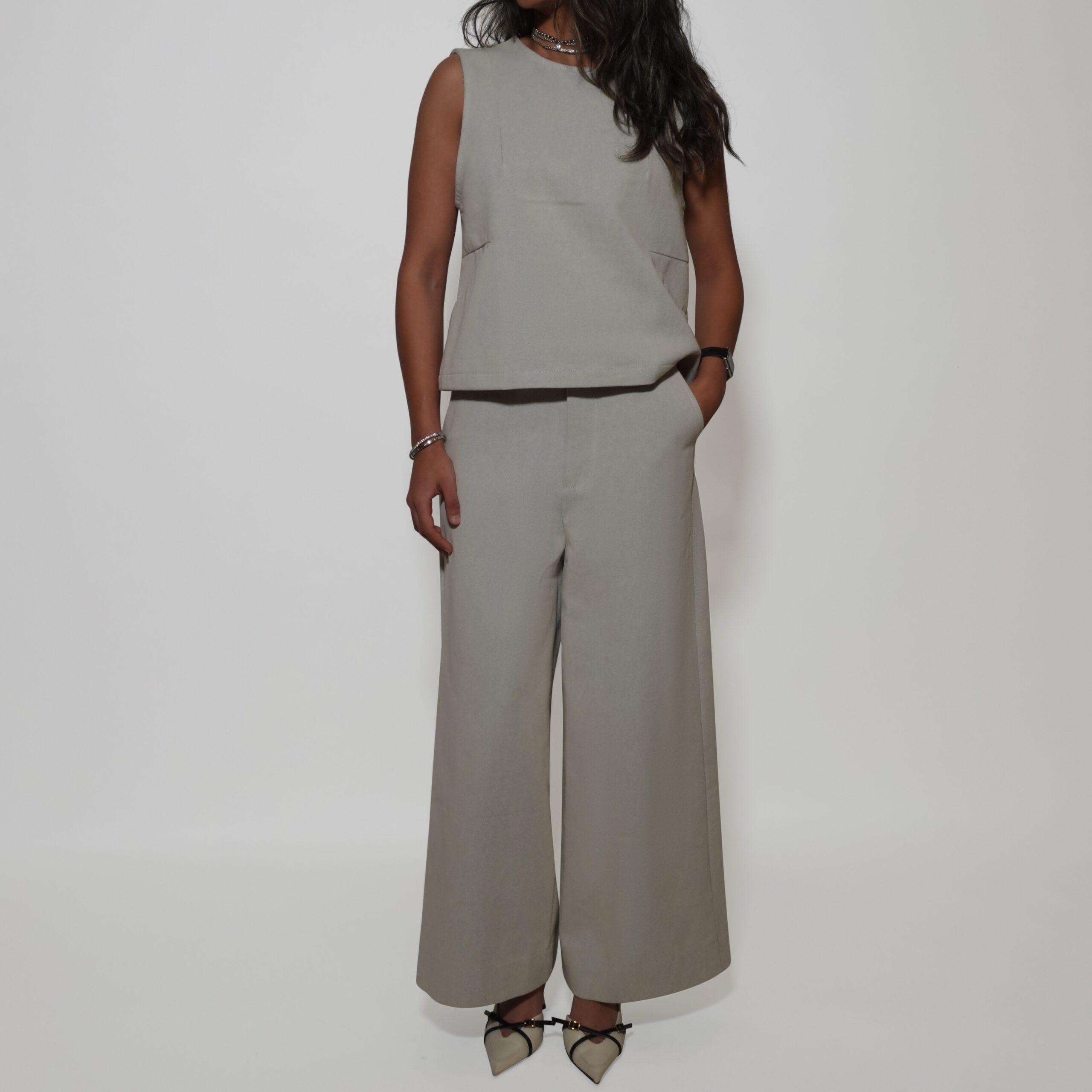 This minimalist two-piece set combines effortless comfort with refined style. Featuring a sleeveless, boxy-fit top and matching wide-leg trousers, it creates a clean, modern silhouette that’s both relaxed and polished.