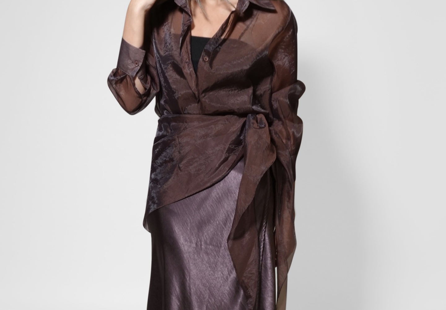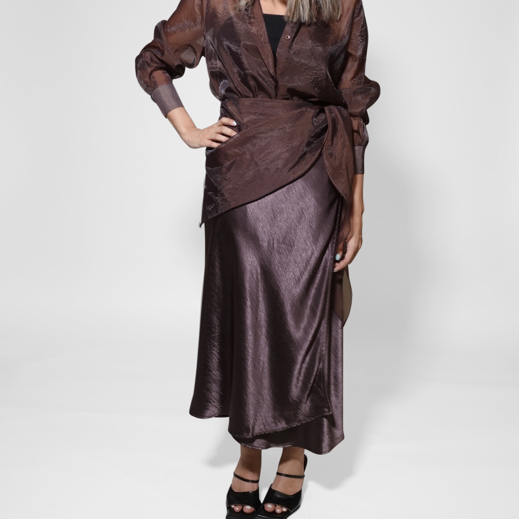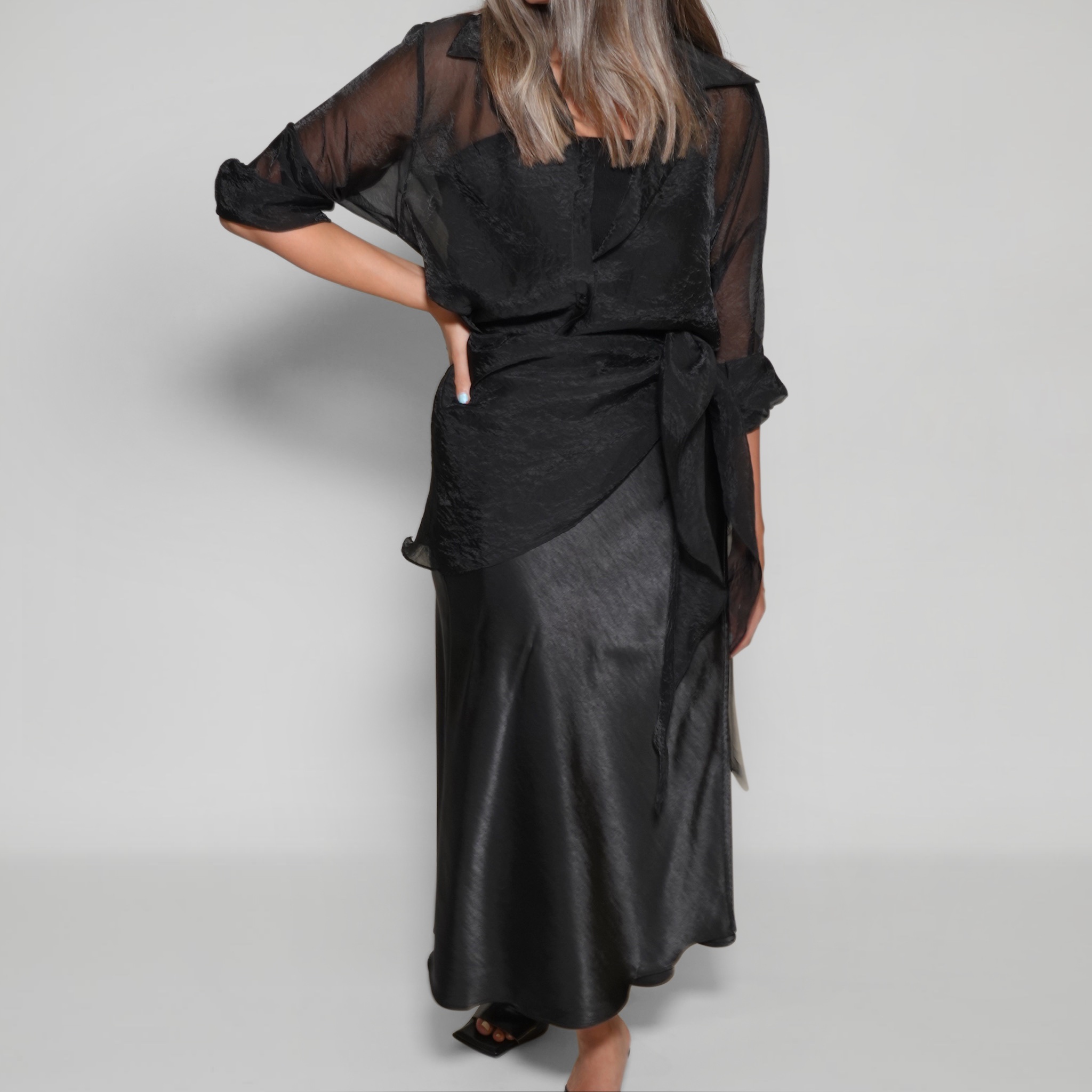 This sheer organza shirt is a statement piece that combines elegance with versatility. Featuring a button-down front, classic collar, and flowing lightweight fabric, it’s perfect for layering over camisoles, bralettes, or dresses. The slightly sheer finish adds a modern, sophisticated edge, making it suitable for both daytime chic and evening refinement.