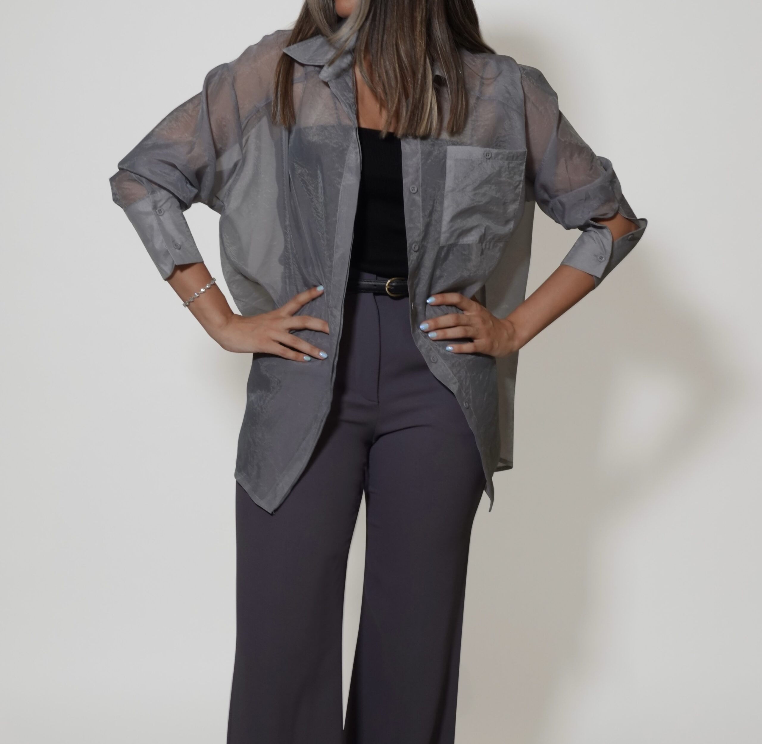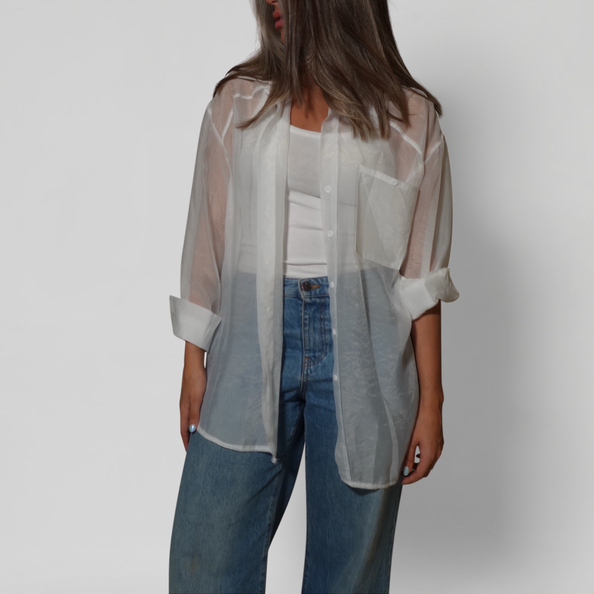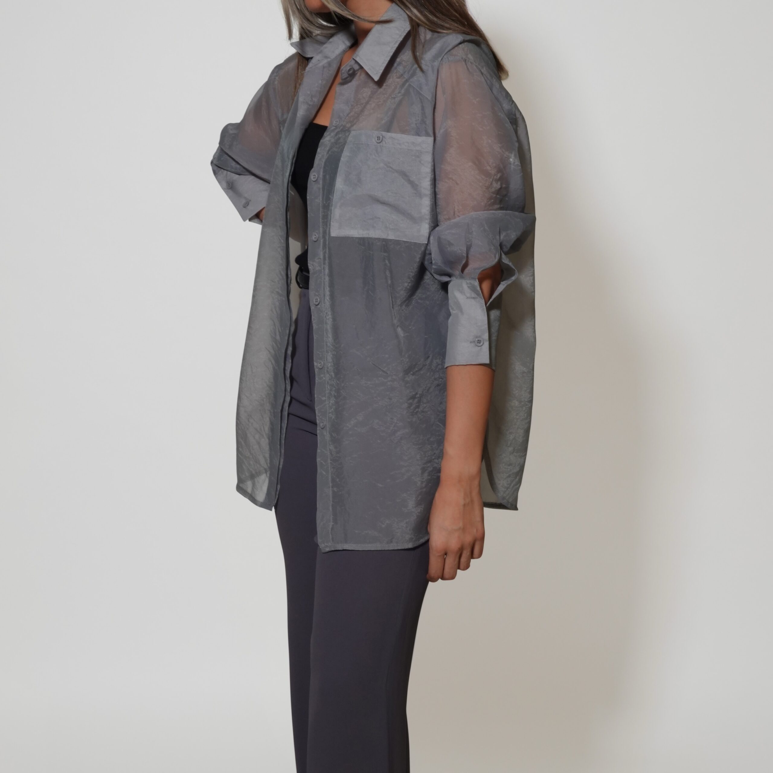 This lightweight sheer shirt blends contemporary style with effortless versatility. Designed with a relaxed, slightly oversized fit, it features a soft translucent fabric that adds a modern, airy feel to any outfit.