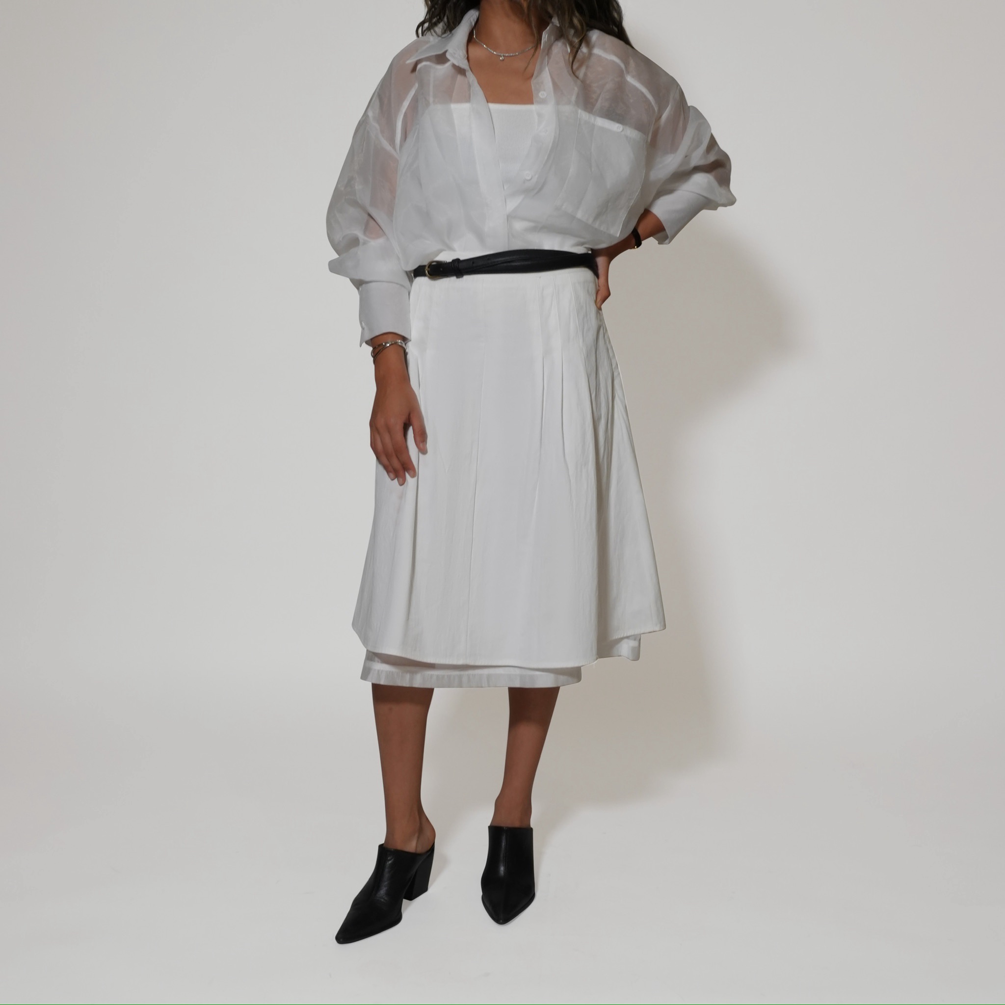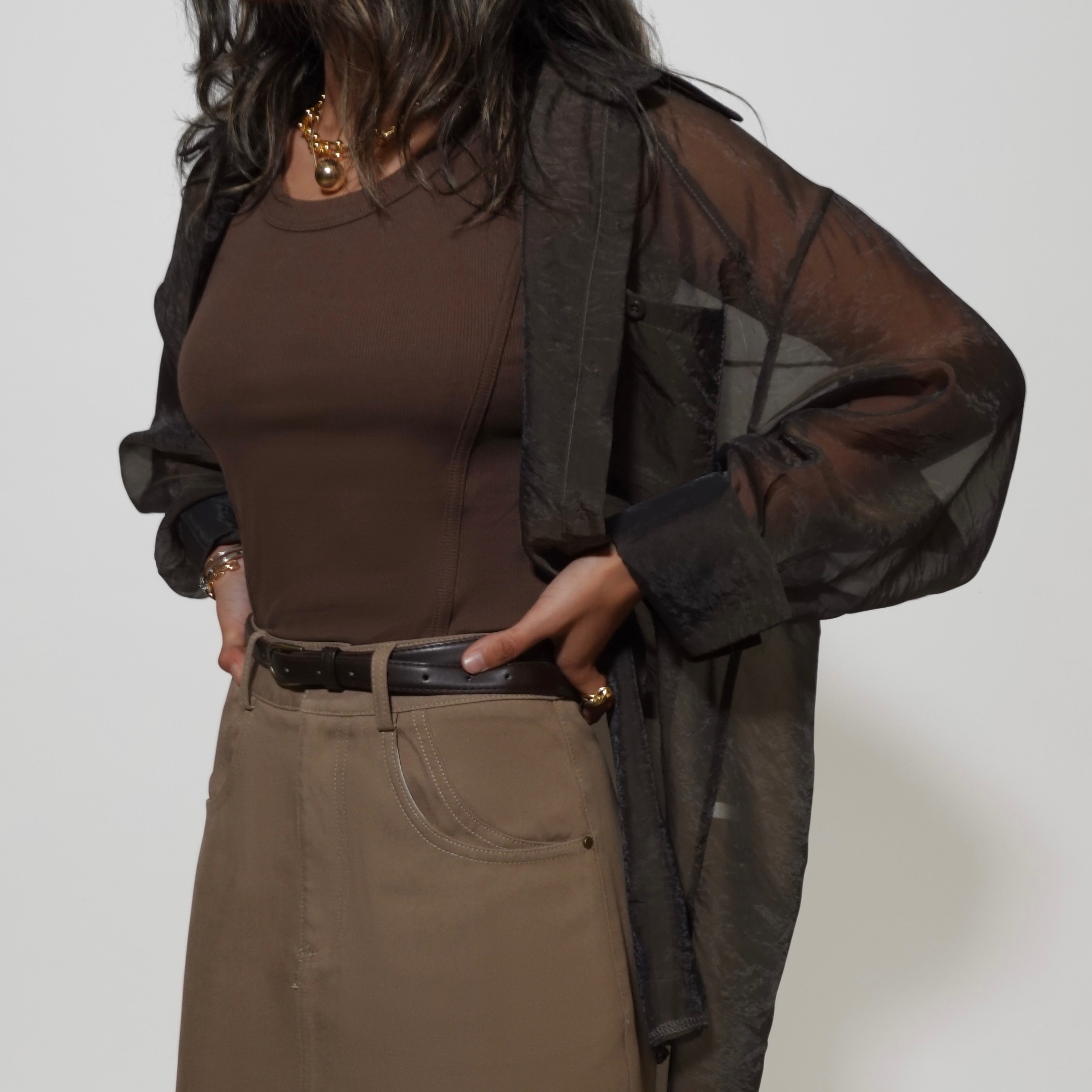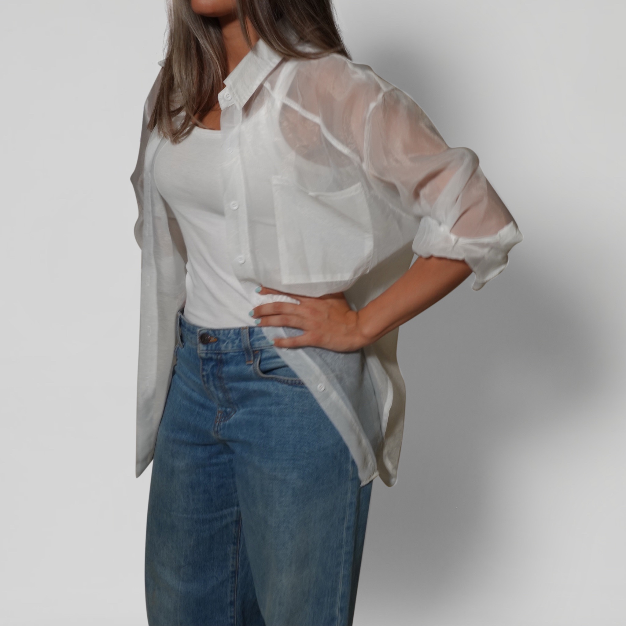 This lightweight sheer shirt blends contemporary style with effortless versatility. Designed with a relaxed, slightly oversized fit, it features a soft translucent fabric that adds a modern, airy feel to any outfit.