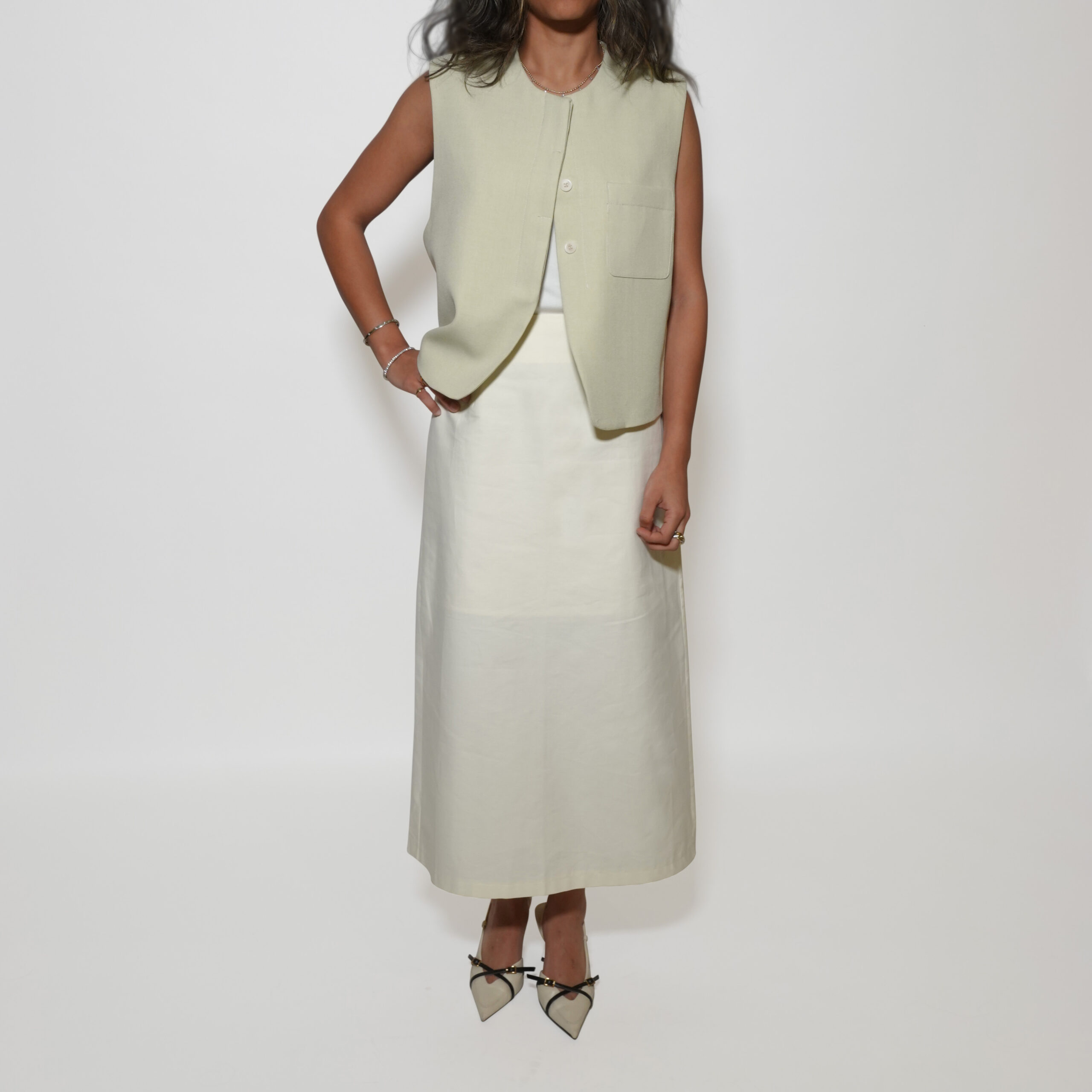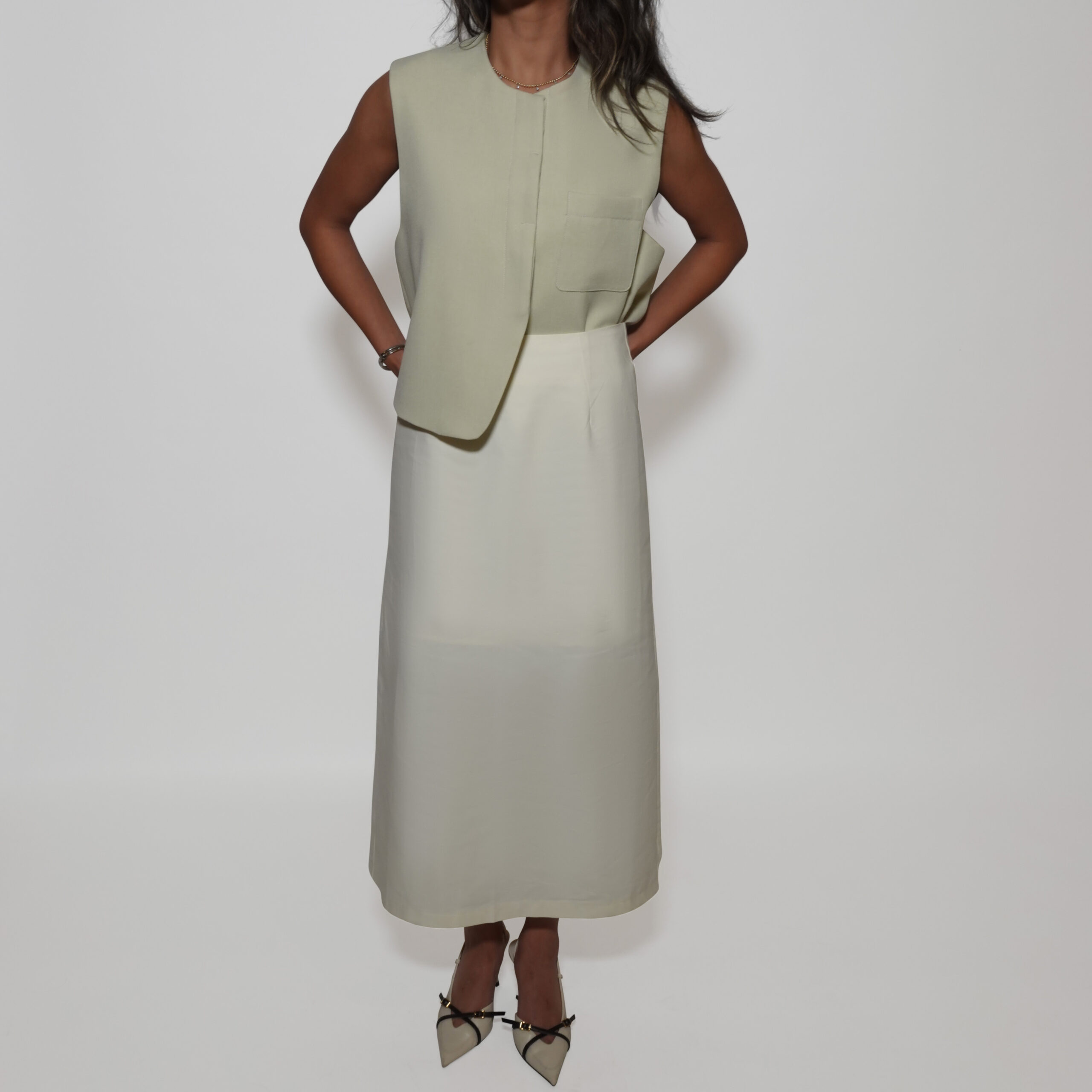 A minimalist sleeveless vest with a clean, modern silhouette, featuring a concealed front closure and a single statement pocket for effortless everyday styling. | soft ivory