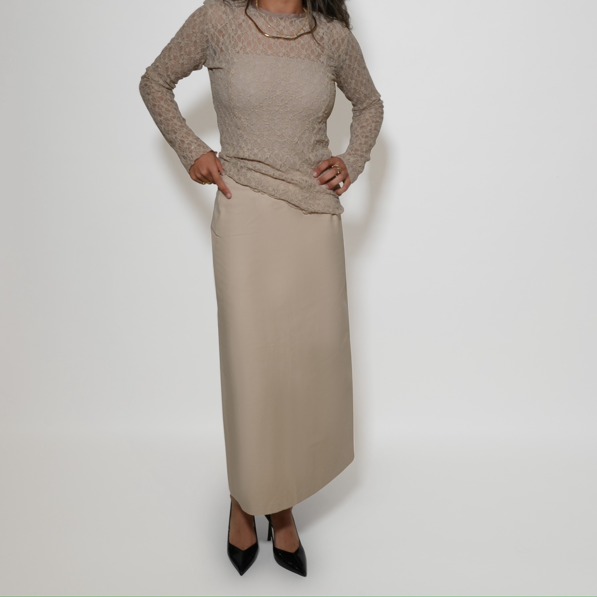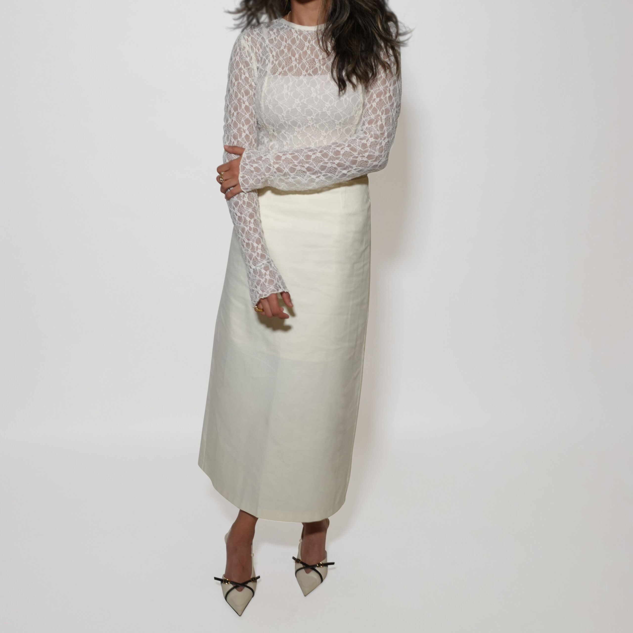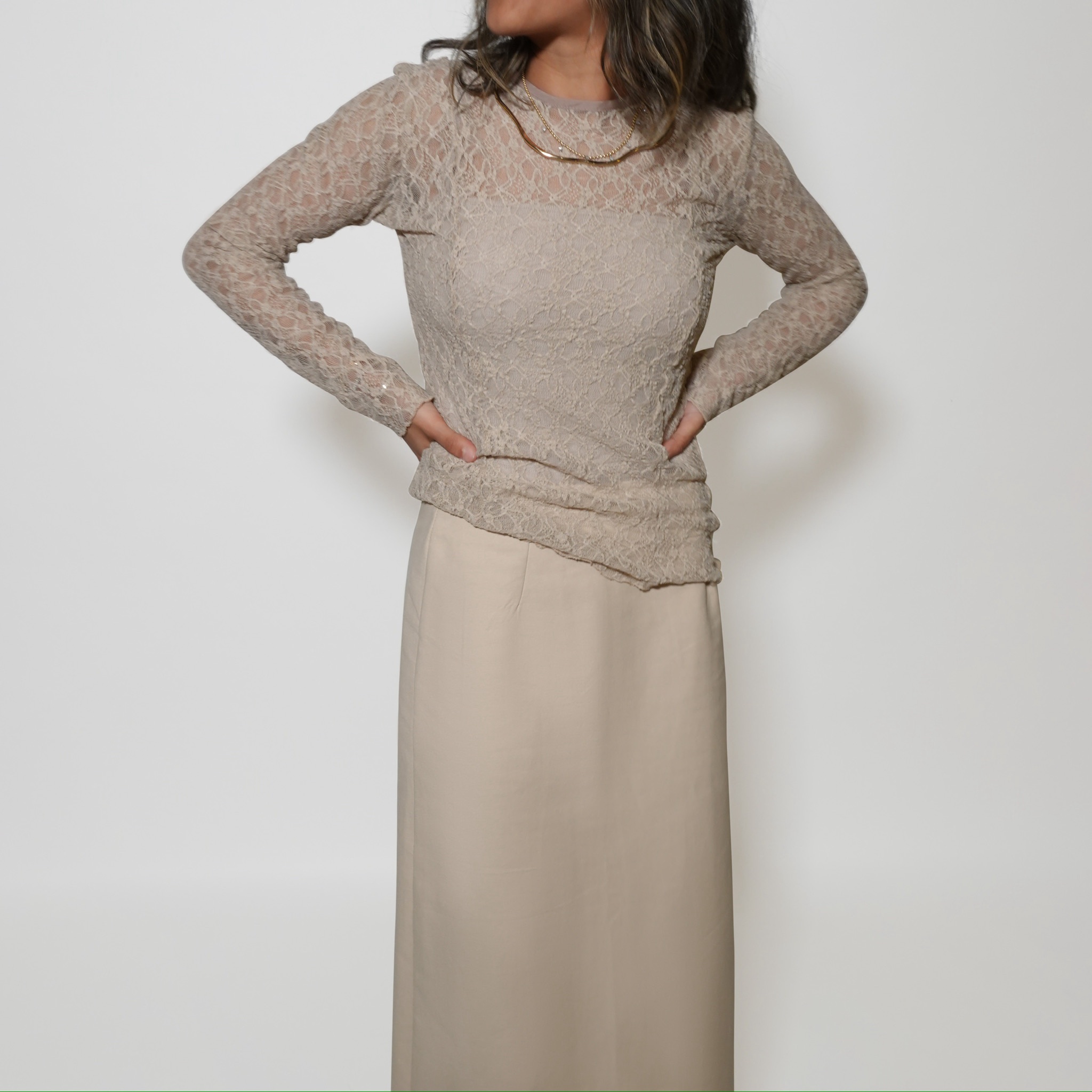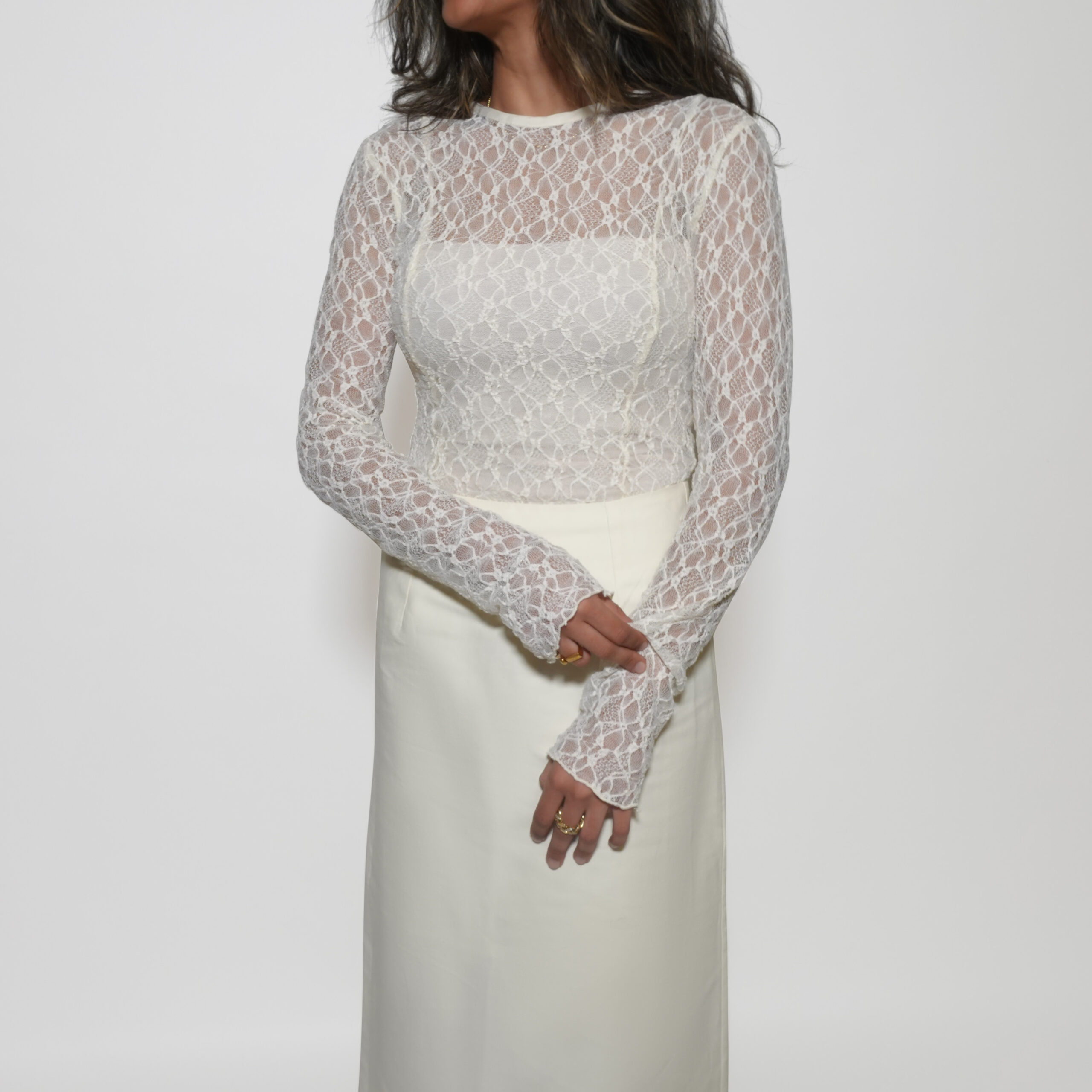 This lace long sleeve top combines elegance and versatility with its delicate texture and refined silhouette. Designed with a fitted shape, it features intricate lace detailing throughout, creating a soft, feminine look with a modern edge.