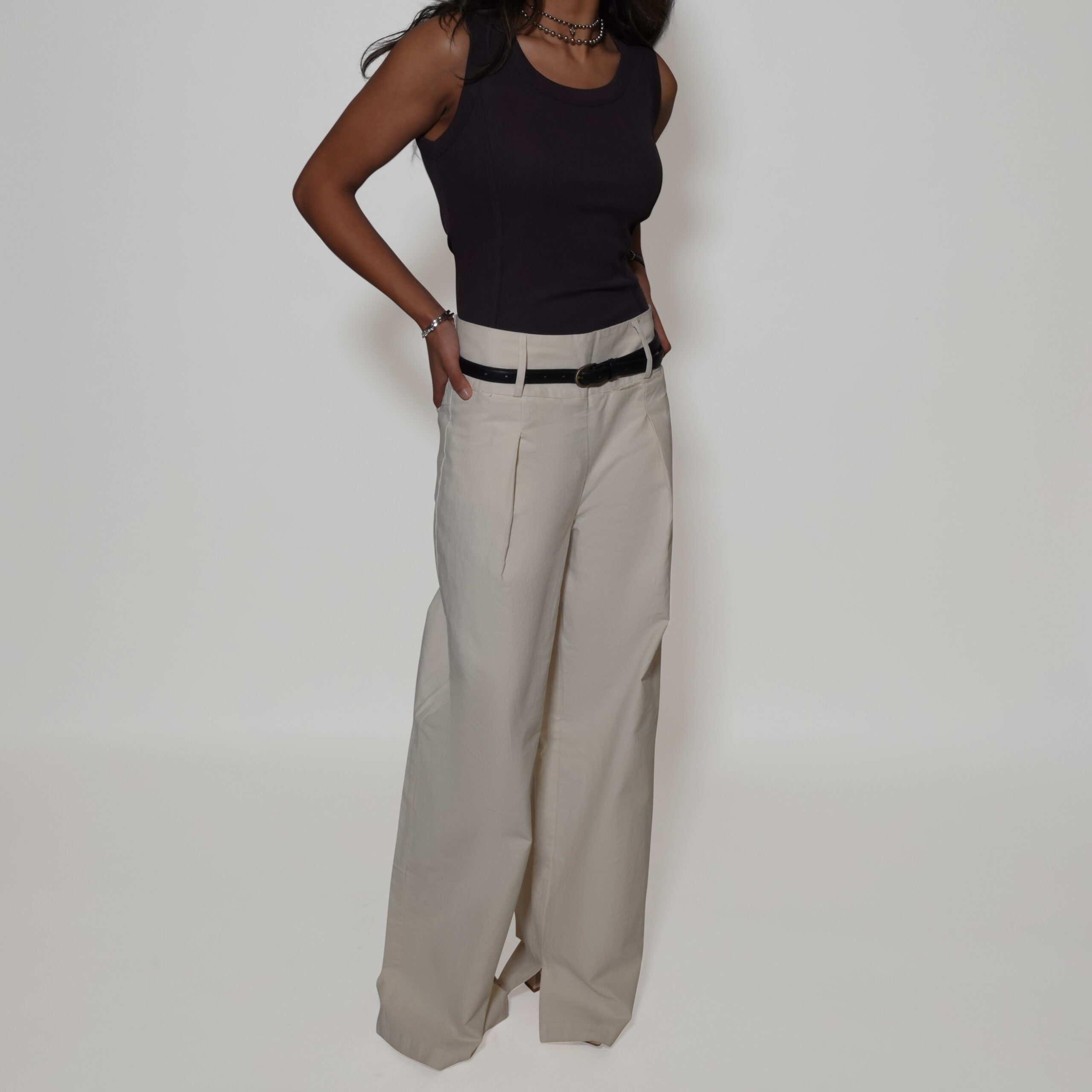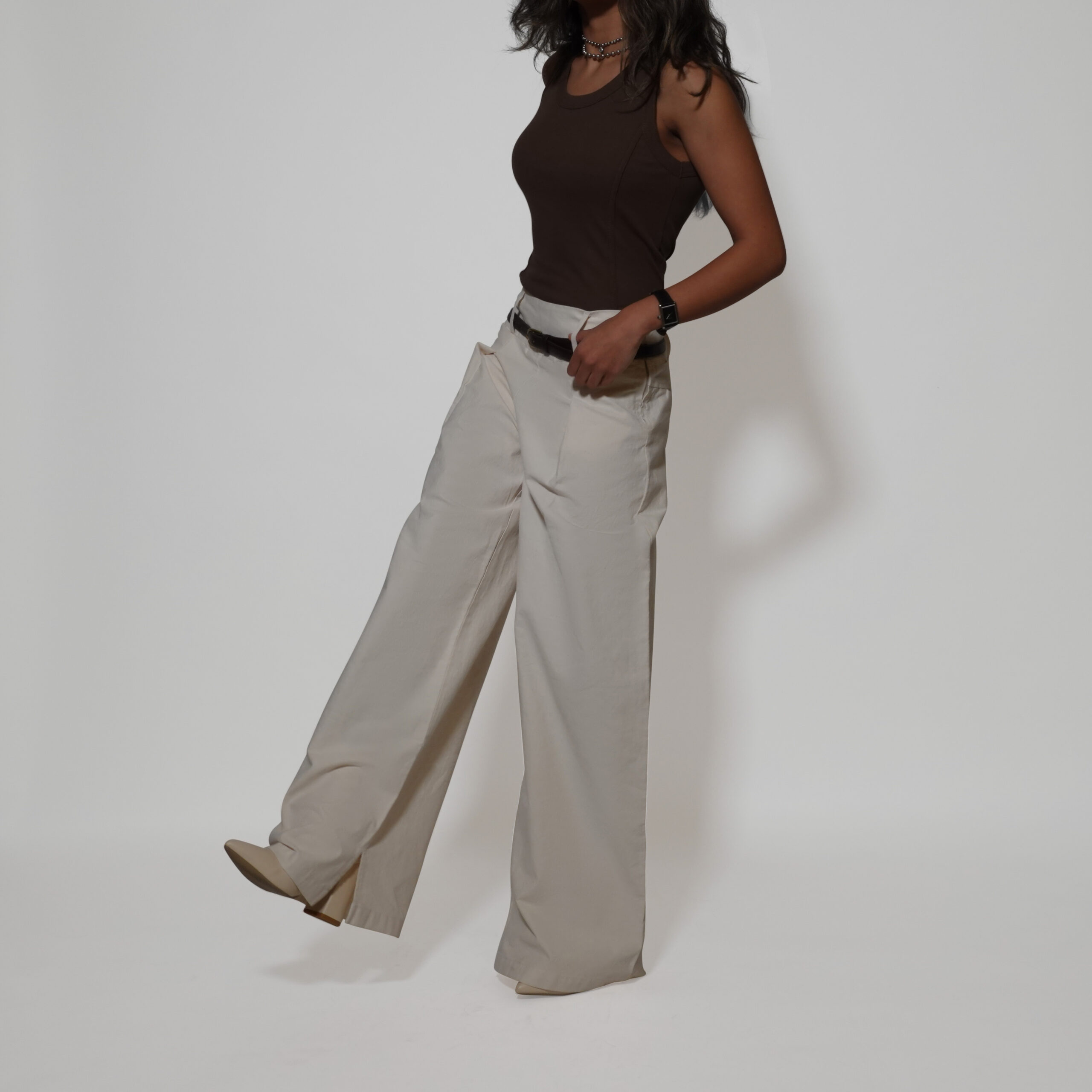 Elegant high-waisted wide-leg trousers with a tailored fit and soft neutral tone—perfect for a chic, modern look.