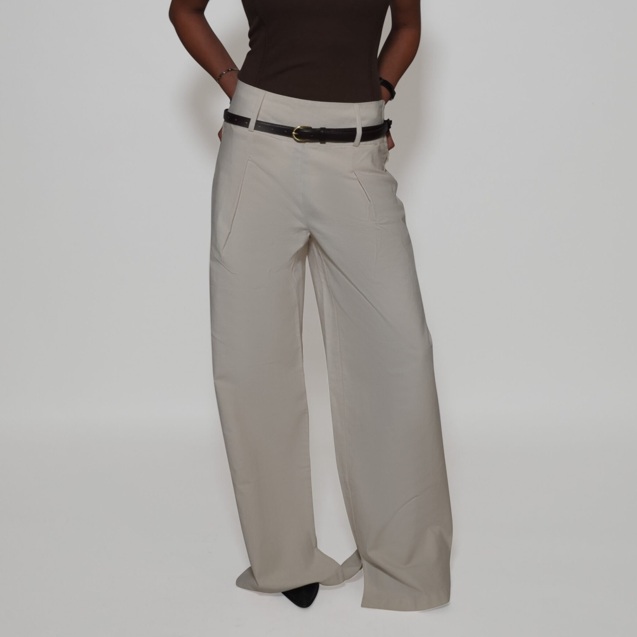 These high-waisted wide-leg trousers combine a flattering silhouette with effortless style. Designed with a tailored finish, front crease detail, and functional pockets, they offer both comfort and sophistication. The versatile cream tone makes them easy to dress up or down for any occasion.